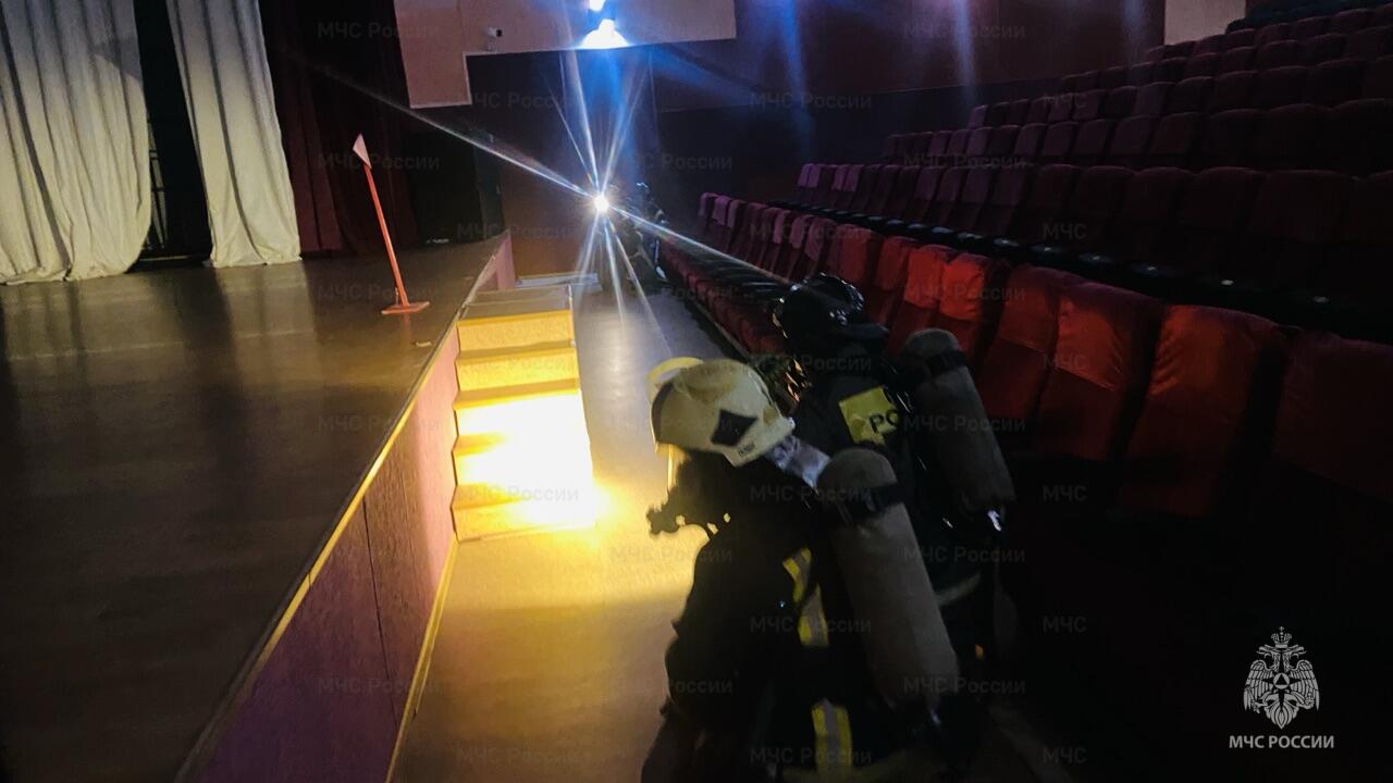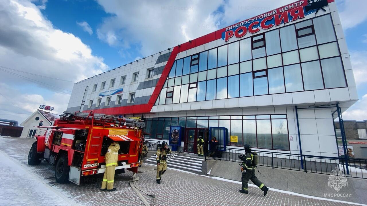 Спасатели провели тренировку по ликвидации условного возгорания в кинодосуговом центре «Россия», в ходе которой эвакуировали четырёх человек из задымлённого зала.